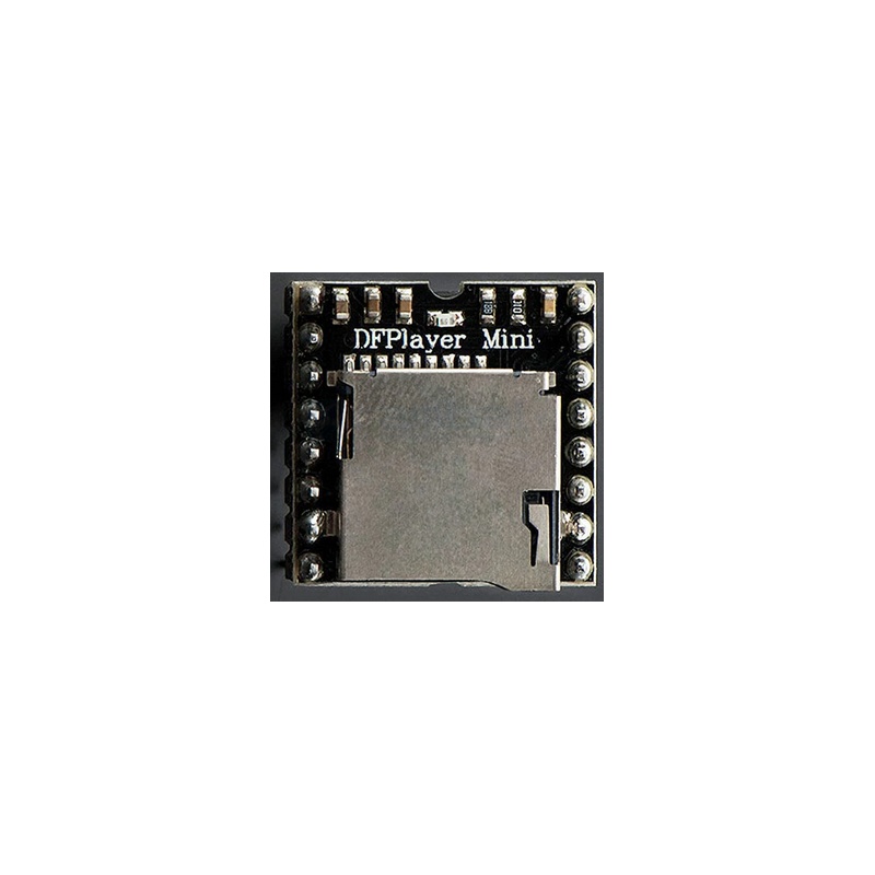 El Mini DFPlayer MP3 o MP3-TF-16P es un reproductor de audio autónomo que puede reproducir archivos en formato MP3 directamente desde una tarjeta microSD (TF). Está diseñado para integrarse en proyectos de electrónica, robótica o domótica, permitiendo la reproducción de efectos de sonido, música o mensajes de voz de forma sencilla.