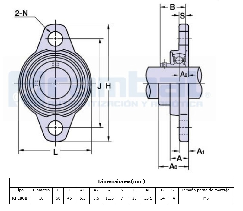 Las unidades de rodamiento de serie KFL, posee un rodamiento de bolas de acero cromado montado en una carcasa de soporte lateral de aleación de zinc con dos perforaciones para pernos de instalación. El método de fijación del eje es con tornillo prisionero.